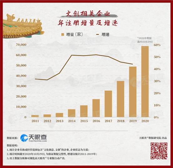 天眼查数据显示,我国目前有28.7万家文创相关企业。从注册趋势上看,近年来我国文创相关企业年注册量持续走高,增速已经连续7年稳定在40%以上。