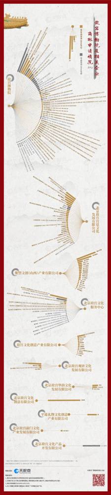 天眼查数据研究院通过梳理数据发现,故宫对其IP的打造可以清晰地从它历年的商标申请情况中窥见一斑。天眼查数据显示,截至2020年10月25日,据不完全统计,故宫博物院共申请了384个文字商标,其对外投资企业(包含直接或间接持股)共申请了660个文字商标。