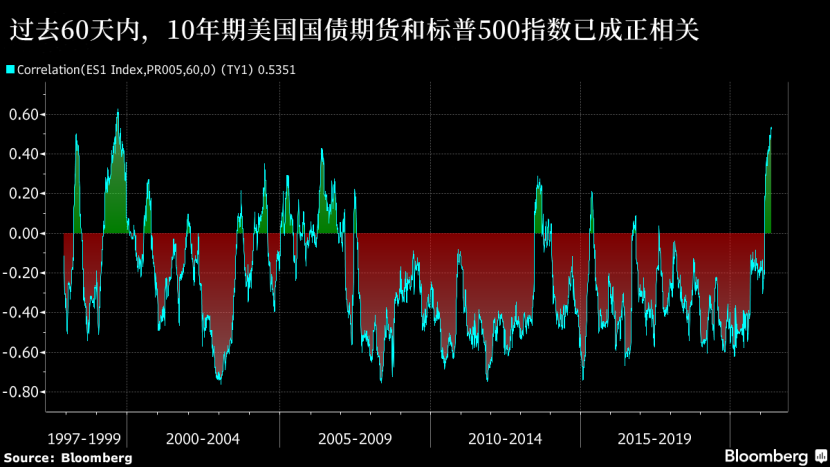 但是在周三,10年期美国国债期货与标普500指数之间的相关系数为正,而且竟然达到了0.5,这是在1999年以来首次。