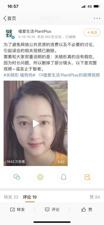 对此,植爱生活和关晓彤工作室官方微博分别发文回应,并附上完整视频,解释称,关晓彤并没有假吃,是因为视频时长问题,删掉了部分镜头。