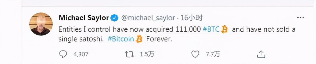 塞勒还说,他控制的实体加在一起总共购买了11.1万枚比特币,没有卖过一枚。这条推文收获了7万多条点赞。