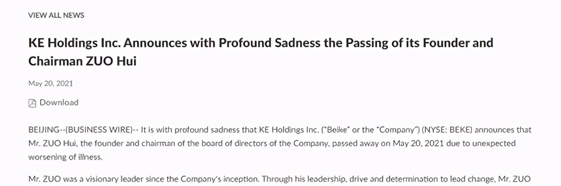 5月20日消息,贝壳公司创始人兼董事长左晖因疾病意外恶化于2021年5月20日去世。