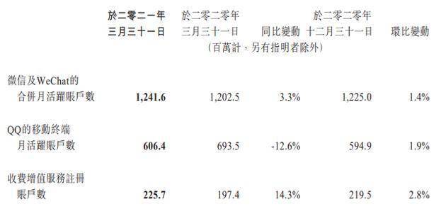 其中,一季度微信及WeChat合并月活跃用户数12.416亿,同比增长3.3%。QQ移动终端月活跃用户数达6.064亿,同比减少12.6%。收费增值服务注册用户数2.257亿,同比增加14.3%。