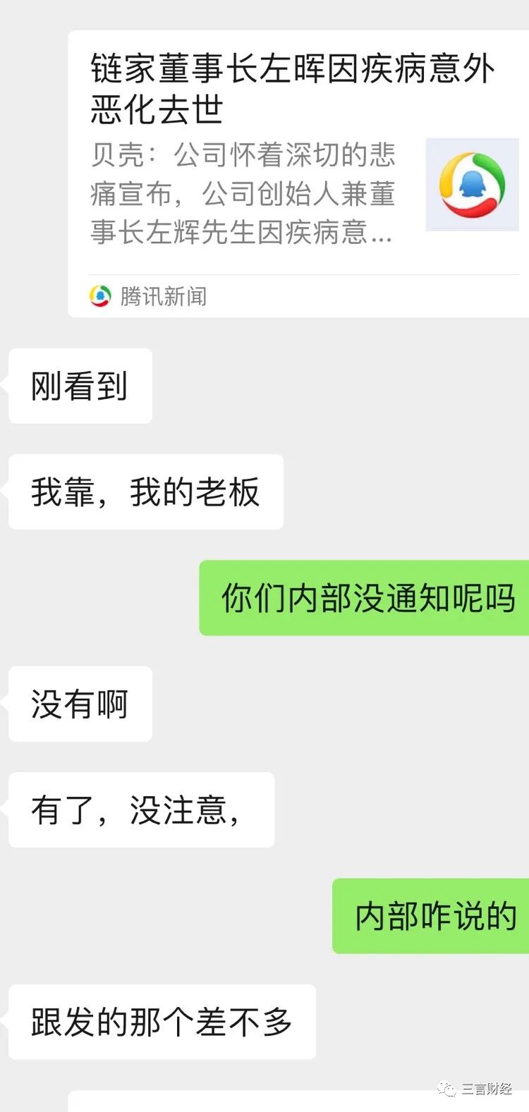 关于左晖去世的消息,链家内部员工告诉三言财经,公司内部已经通告此事,大家对此也深感震惊。该员工表示,此前知道其身体存在健康问题,但没想到突然人就走了,深感惋惜。