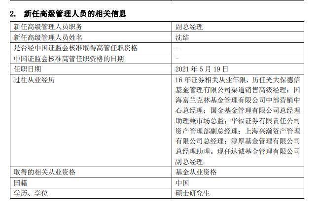 5月20日,达诚基金管理有限公司发布高级管理人员任职公告,新任沈结为副总经理,任职日期2021年5月19日。