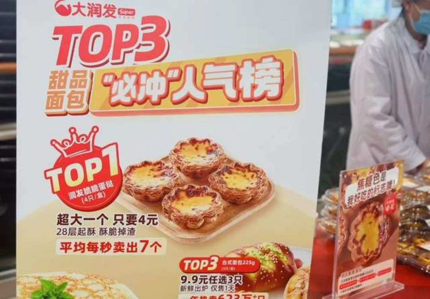 大润发也在尝试搞自己的“瑞士卷”,2024年7月上市的自研蛋挞“润发脆脆蛋挞”是大润发力推的热门产品,内部预计其有望成为年度破亿的超级大单品。
