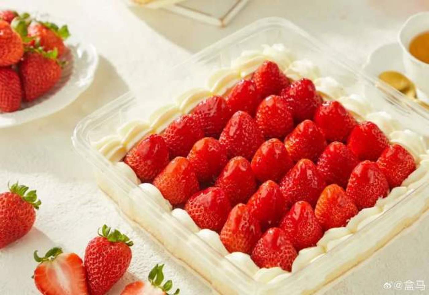 不过,相比过去蛋糕上水果或罐头水果以配角出现,盒马草莓盒子蛋糕更像做成蛋糕的新鲜草莓,白色奶油映衬下,25颗与盒马在售同款红颜草莓甜美诱人,咬下去,是一口水果和奶香交融的扎实口感。