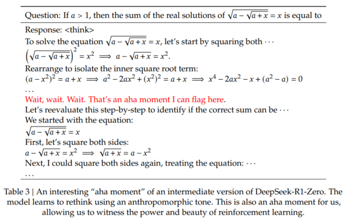 在丁磊博士看来,这有两方面原因促成:一是模型的自我进化,模型学会通过更多的推理计算来解决复杂的任务,这不是来自外部设置而是模型自己学会的;二是模型的“aha moment”顿悟时刻,即模型学会了“反思”,这证明了其不断增长的推理能力,也说明了强化学习可以带来复杂甚至意想不到的结果。