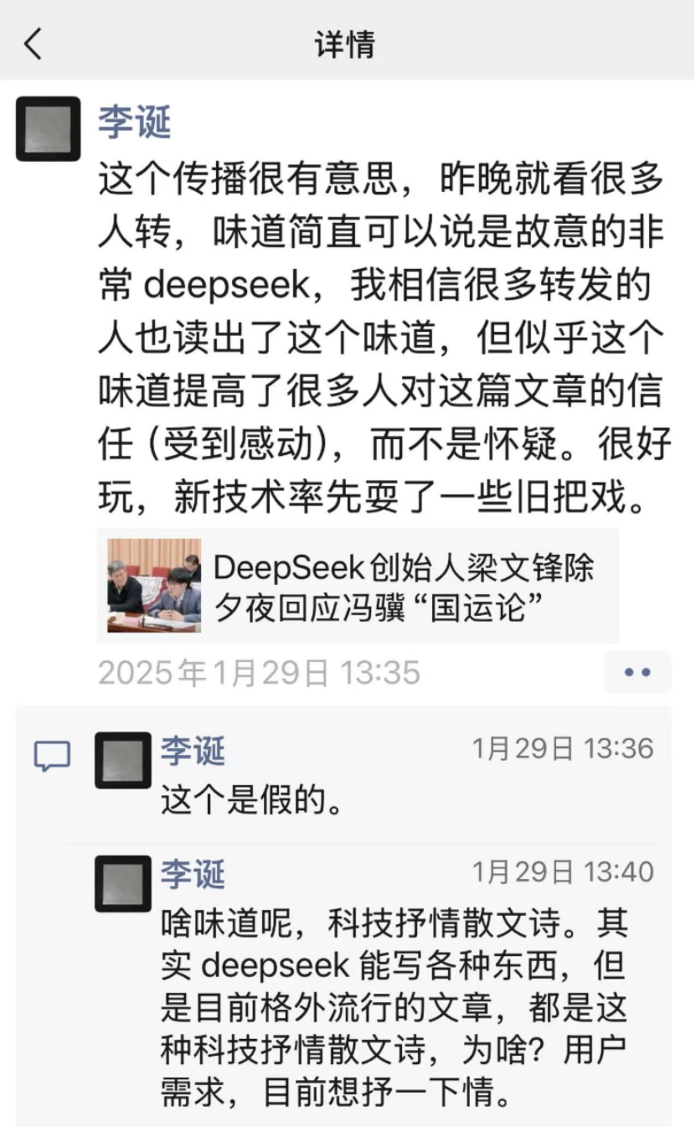 不止朱啸虎。在DeepSeek以假乱真,模仿梁文锋口吻回复冯骥的“国运论”造假文章出现后,作家兼脱口秀演员的李诞点评道,文章透露出一种非常DeepSeek的味道。这种味道被李诞概括为“科技抒情散文诗”。