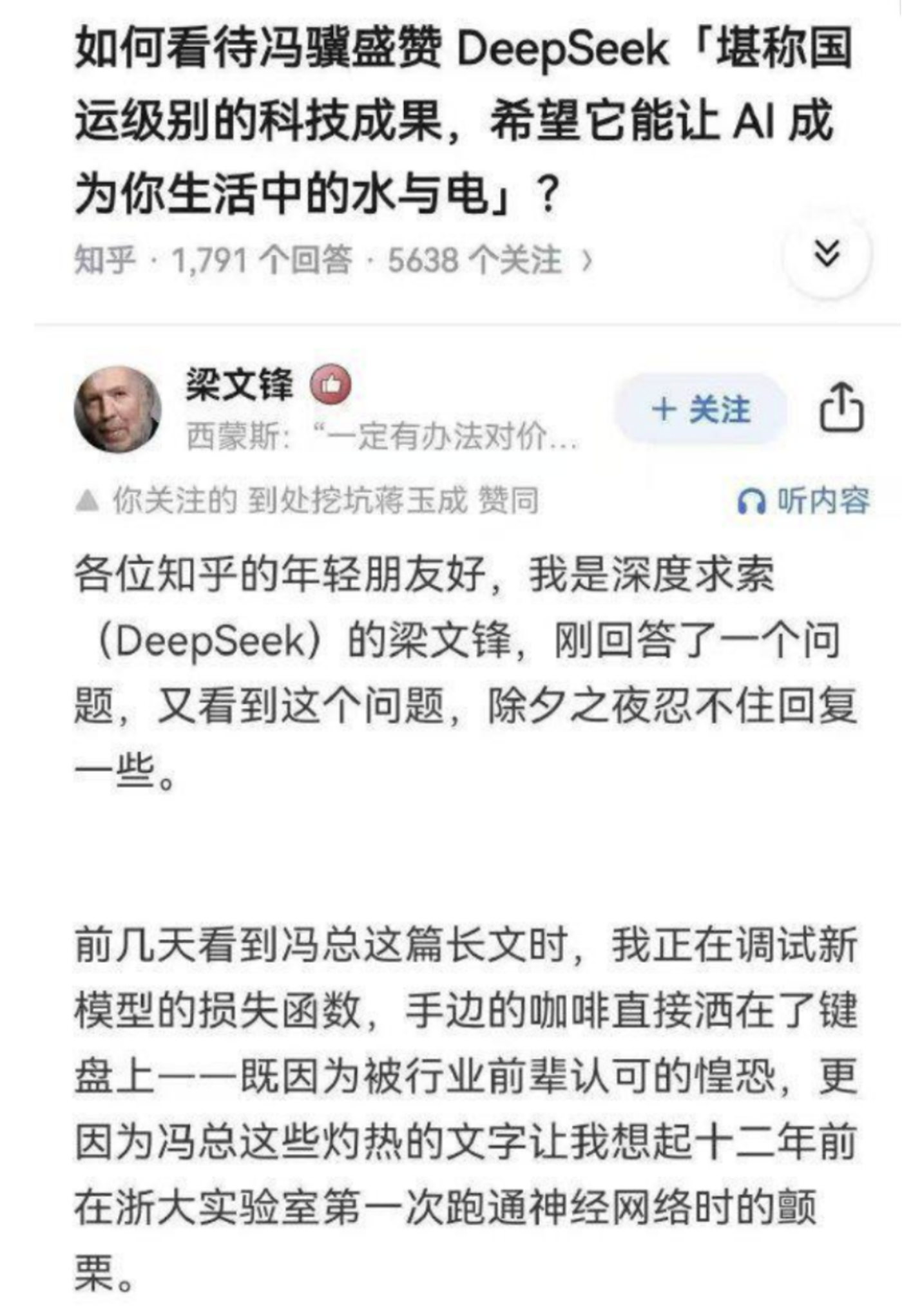 但简单搜索下梁文锋的履历便可知道,在十二年前的2013年,梁文锋已经从浙江大学硕士毕业三年。当年,梁文锋与其浙大同学徐进共同创立了杭州雅克比投资管理有限公司,DeepSeek给出的梁文锋在浙大实验室做实验的场景,大概率是自行编造而来。
