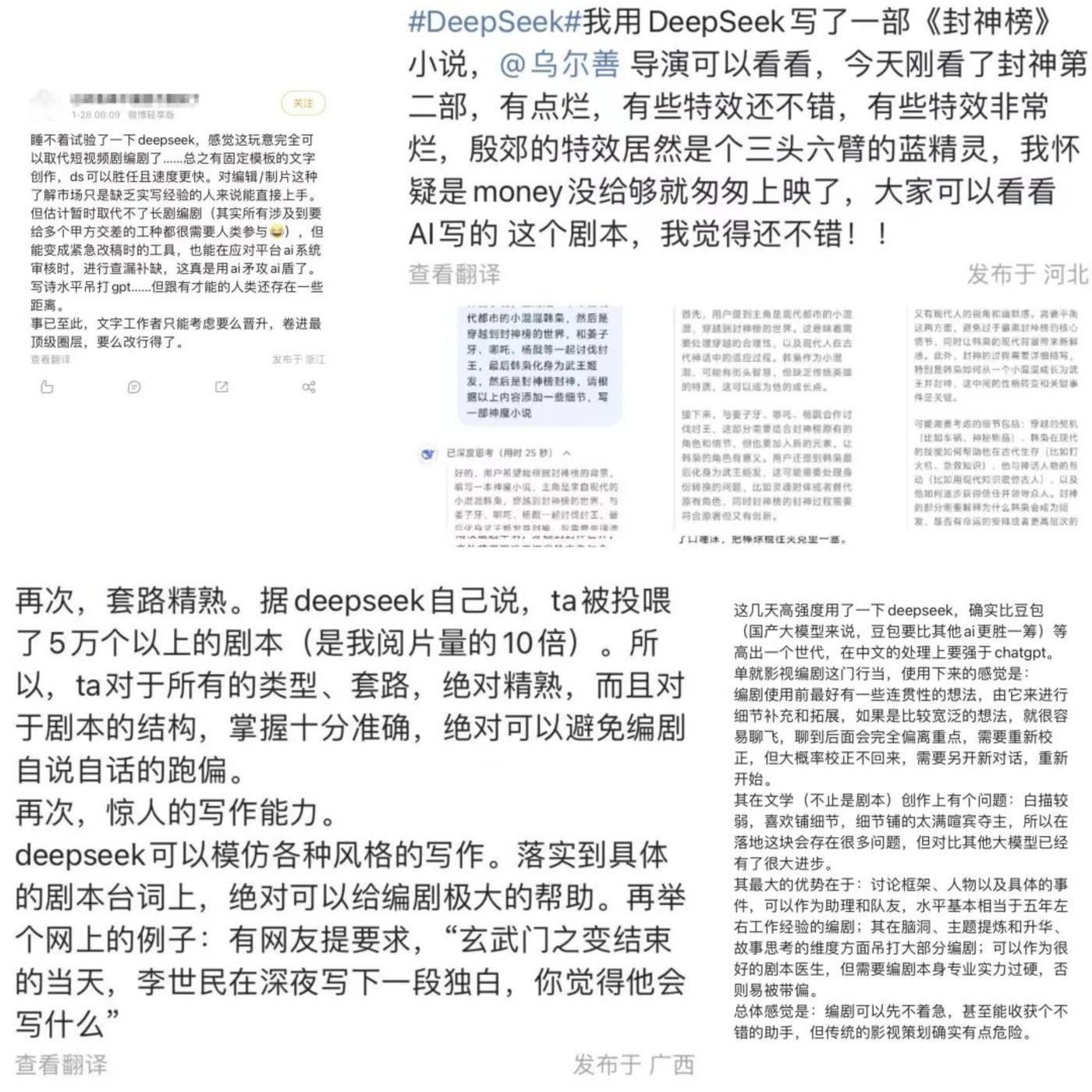 有网友尝试用 DeepSeek写了《封神榜》小说,并@乌尔善 导演“大家可以看看AI写的这个剧本,我觉得还不错!! ” 也有网友试用DeepSeek之后,感慨编剧领域的基础岗位很快就会被AI完全取代。网友们对DeepSeek的创作惊叹不已,同时也带给编剧行业巨大的冲击。