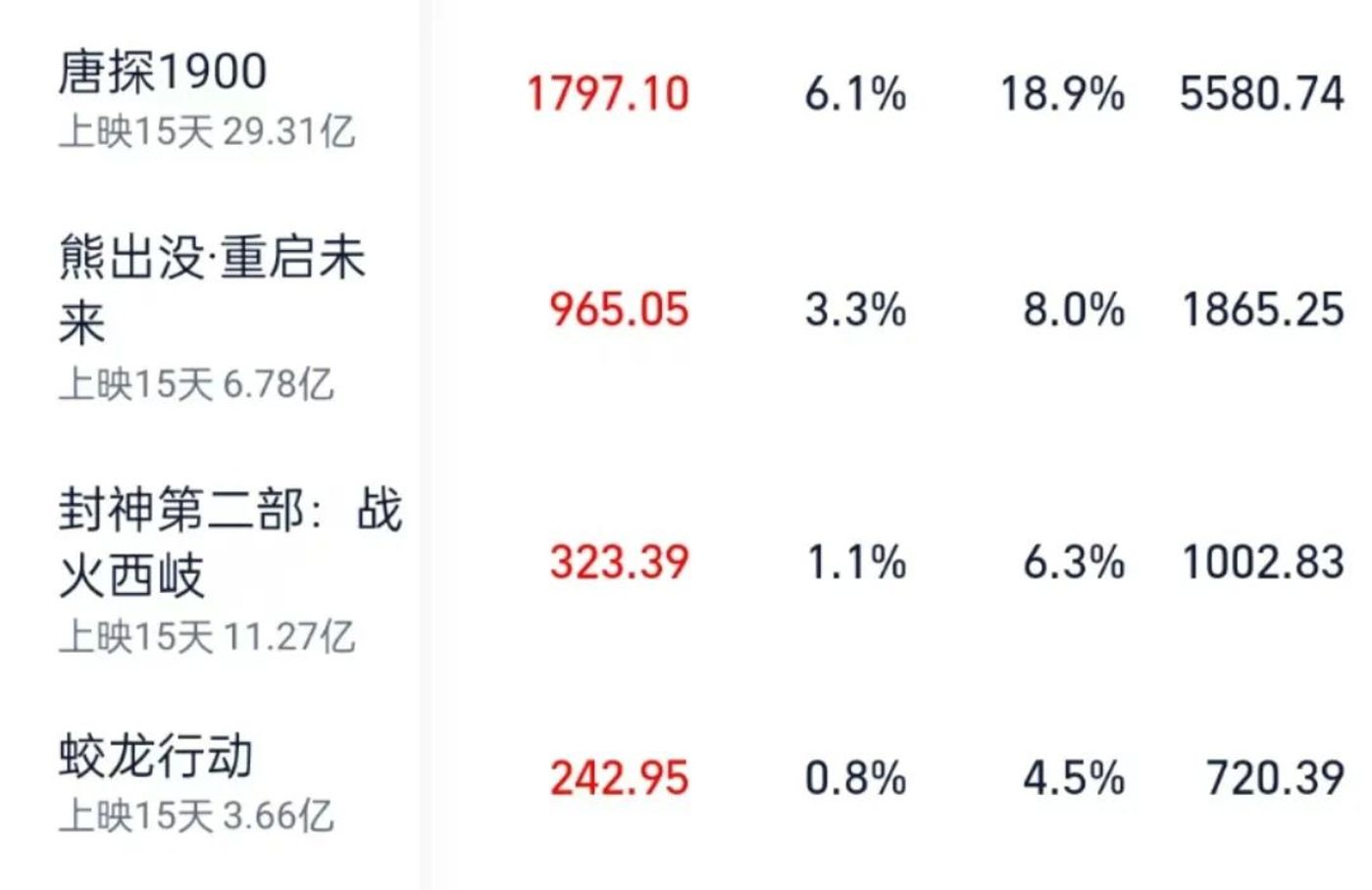 而万达影视出品的《唐探1900》票房表现稳扎稳打,联合出品的《熊出没:重启未来》虽然较前作票房有所下滑,但仍稳住了基本盘。另一边,则是北京文化的核心项目《封神第二部:战火西岐》表现不如预期;博纳影业的心血之作《蛟龙行动》更是遭遇了票房滑铁卢,只能敬陪末座。