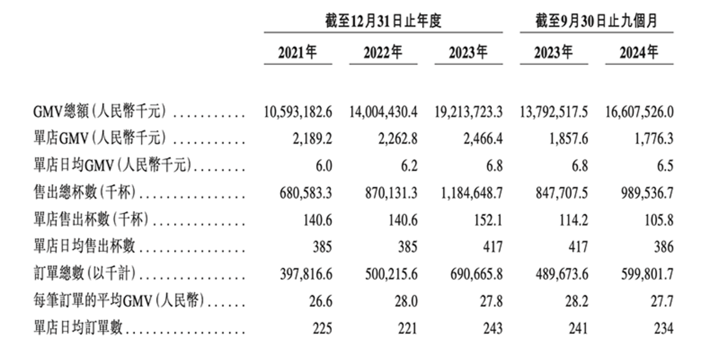 其中单店日均GMV,从2023年前三季度的6800元下滑至6500元,单店日均售出杯数从417减少至386。每笔订单的平均GMV从28.2元减少至27.7元。