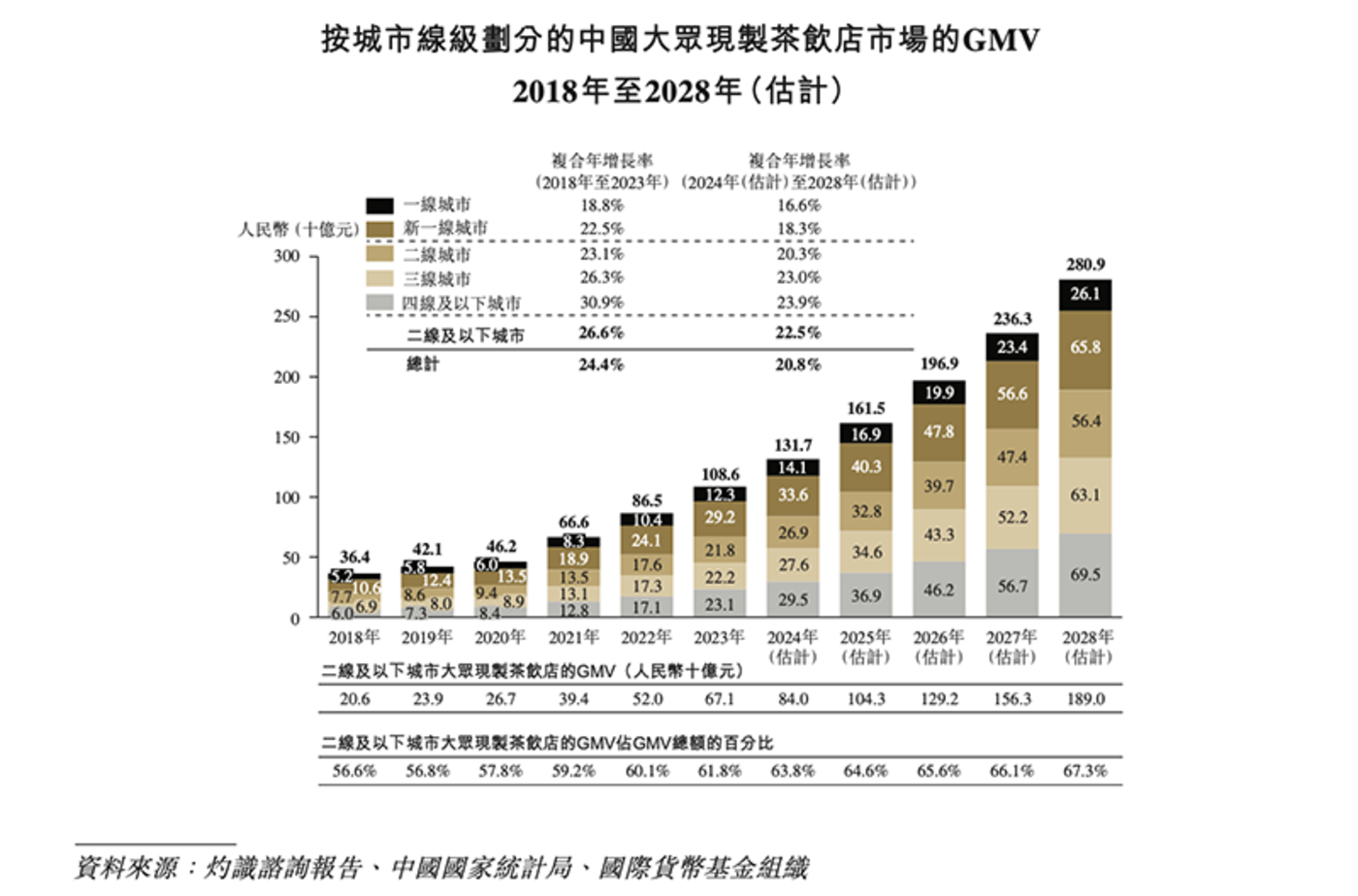 据灼识咨询数据,大众现制茶饮店市场是中国现制茶饮店市场中规模最大、增长最快的细分市场。中国大众现制茶饮店市场的GMV于2023年达到1086亿元,预计于2028年将进一步增加至2809亿元,2024年至2028年的复合年增长率为20.8%。其中,二线及以下城市预计将于2024年至2028年以最快增速发展,并贡献大部分的市场增量。