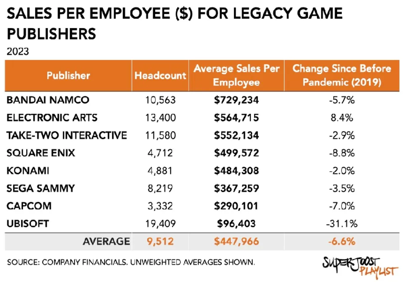这和人数其实无关,因为万代南梦宫和EA以及T2也有着过万的员工,但这些公司的人均创收是育碧的近七八倍。