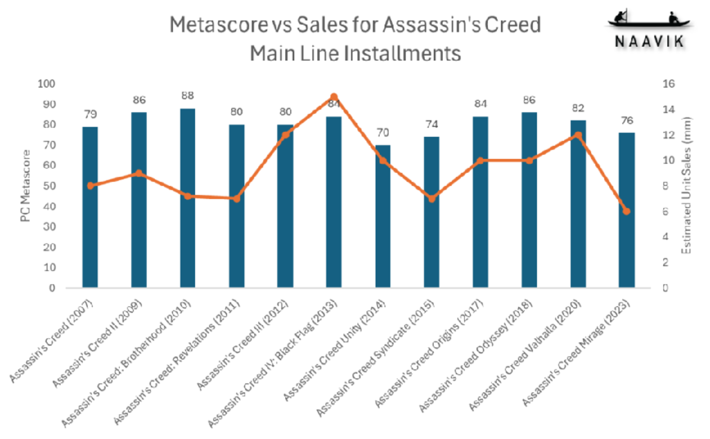拿其最为畅销的《刺客信条》来说,这个系列基本按照一年一款的速度稳步产出,不论是媒体评价还是销量都在水平线之上,有一些创意的,比如引入海战的《刺客信条:黑旗》更是大赚特赚。