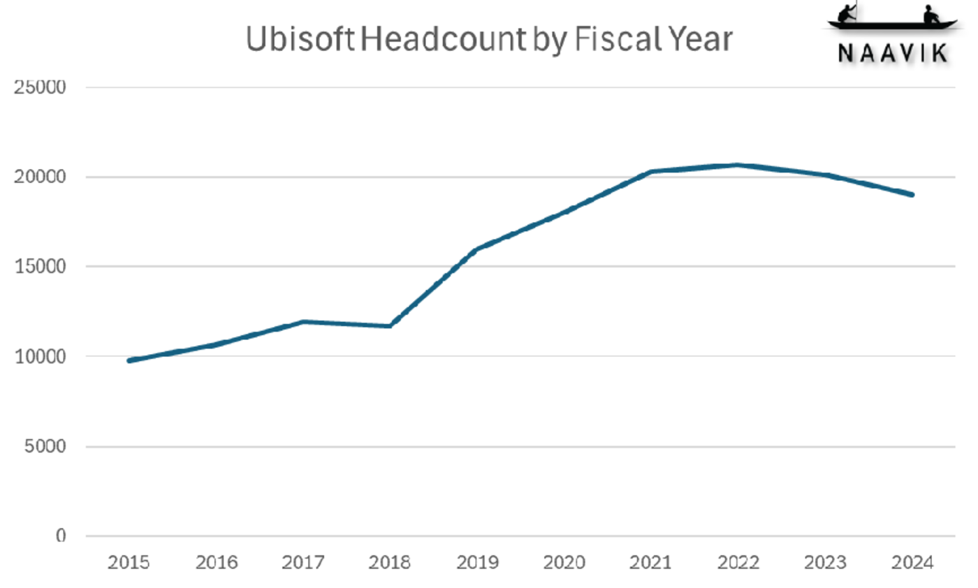 用工成本是其中最大的一部分。尽管裁员是近些年游戏行业的主旋律,但育碧一直不愿进行大规模裁员。据育碧公开的数据显示,从2015年到2024年,这家公司的员工扩充了1万余人。