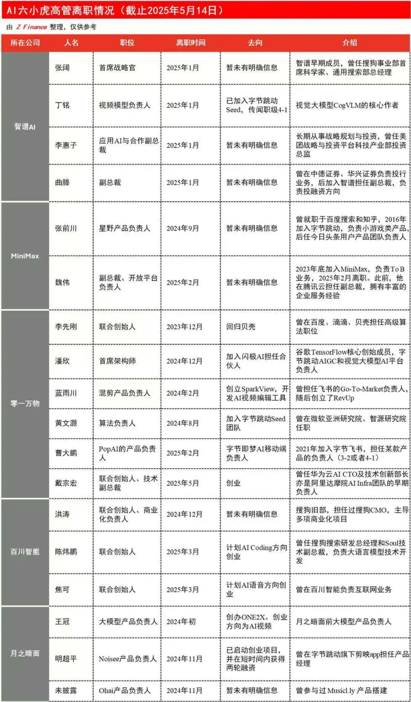 根据Z Finance统计,除了阶跃星辰暂未出现高管离职外,六小龙中其余几家都有核心高管离职。其中智谱AI原视频模型负责人加入字节,月之暗面前大模型产品负责人独立创业。