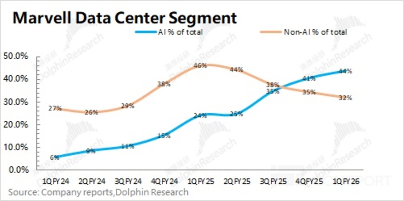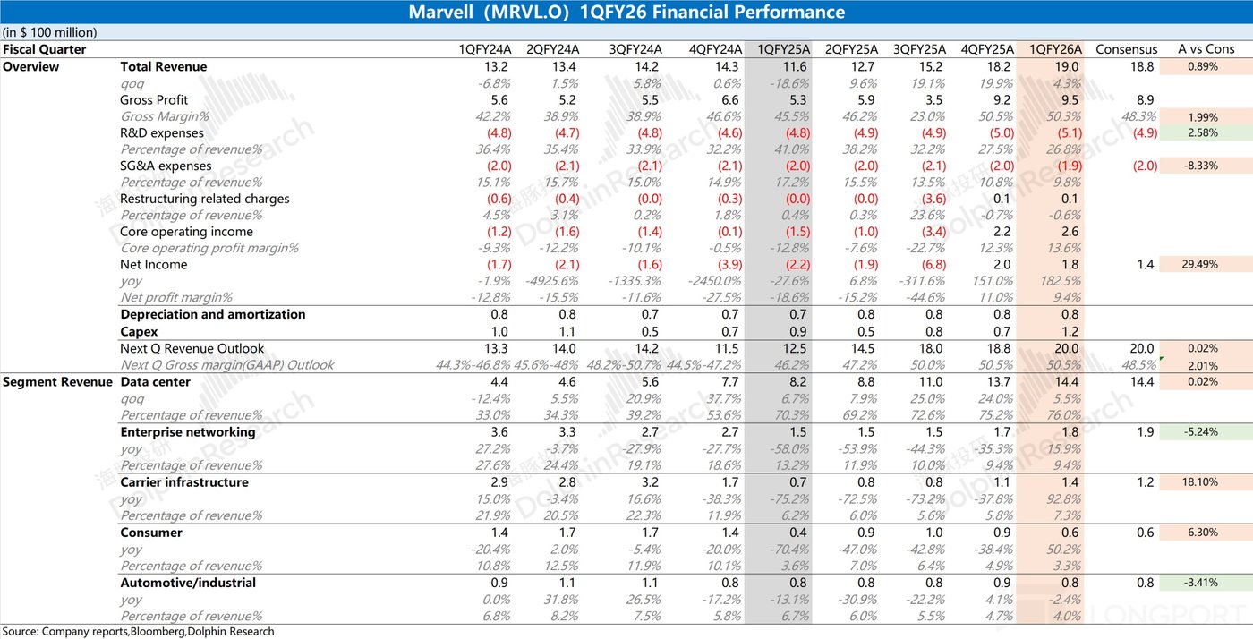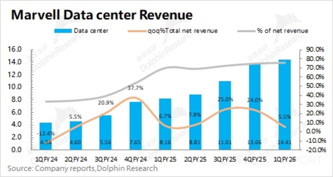 迈威尔科技 Marvell 在 2026 财年第一季度的数据中心业务实现营收 14.4 亿美元,环比增长 5.5%,符合市场预期(14.4 亿美元)。