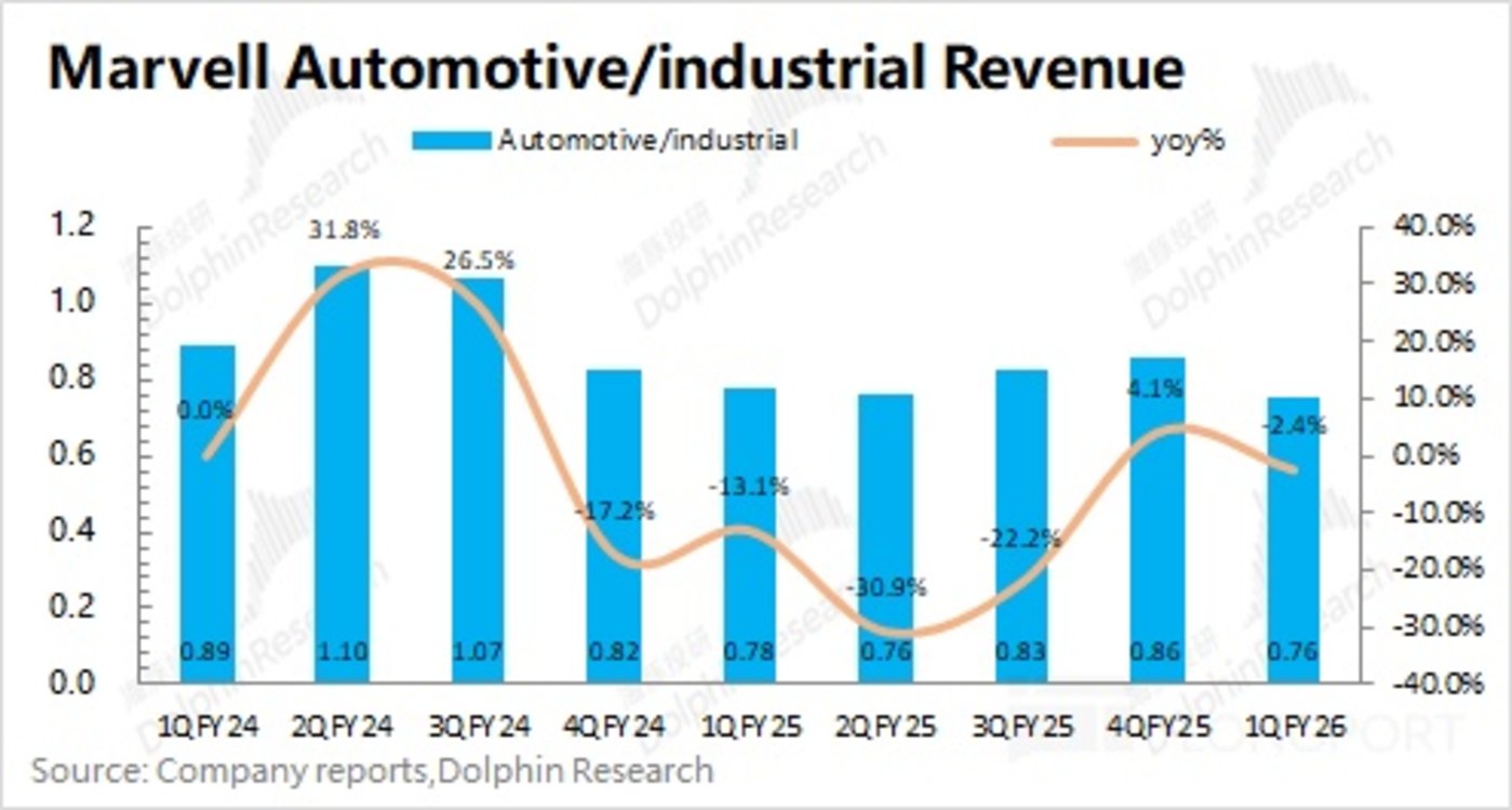 3)迈威尔科技 Marvell 在 2026 财年第一季度的汽车/工业业务实现营收 0.76 亿美元,同比下滑 2.4%。公司汽车/工业业务,主要涵盖自动驾驶、车载娱乐系统、工业机器人等领域,公司主要提供车载以太网等相关产品。