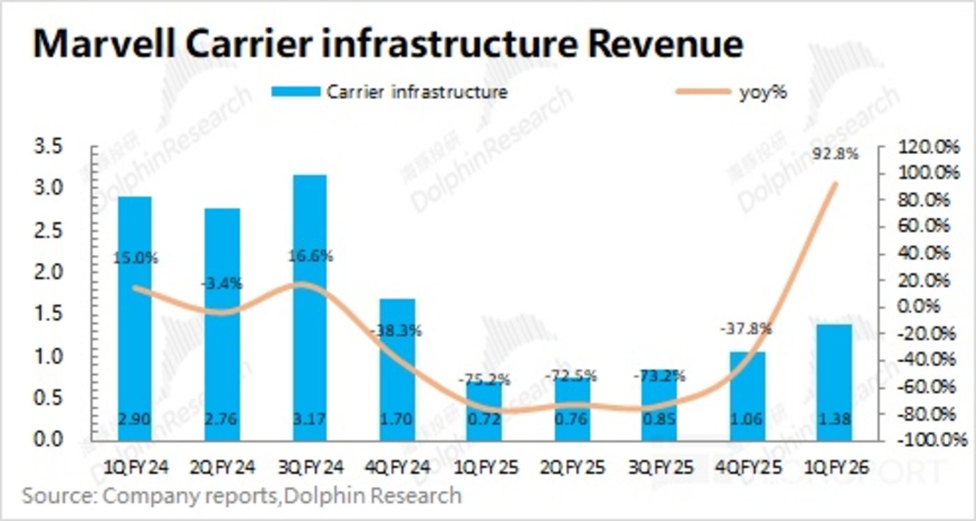 1)迈威尔科技 Marvell 在 2026 财年第一季度的企业网络业务和运营商基建业务分别实现营收 1.78 亿美元和 1.38 亿美元。