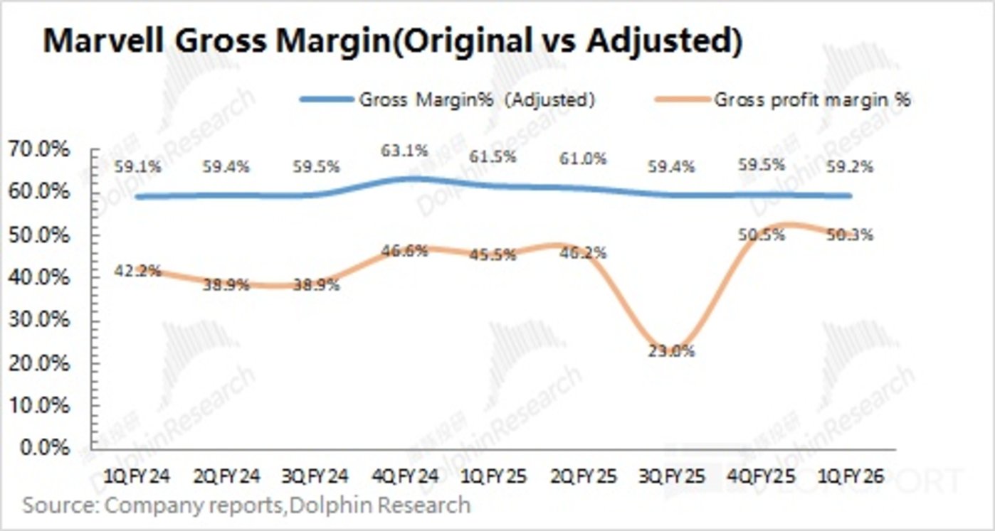 迈威尔科技 Marvell 在 2026 财年第一季度实现净利润 1.8 亿美元。公司调整后的毛利率都在 60% 附近,但公司财报的净利润却在此前较长时间都是亏损的状态,这主要是受收购摊销、重组费用以及其他因素影响。