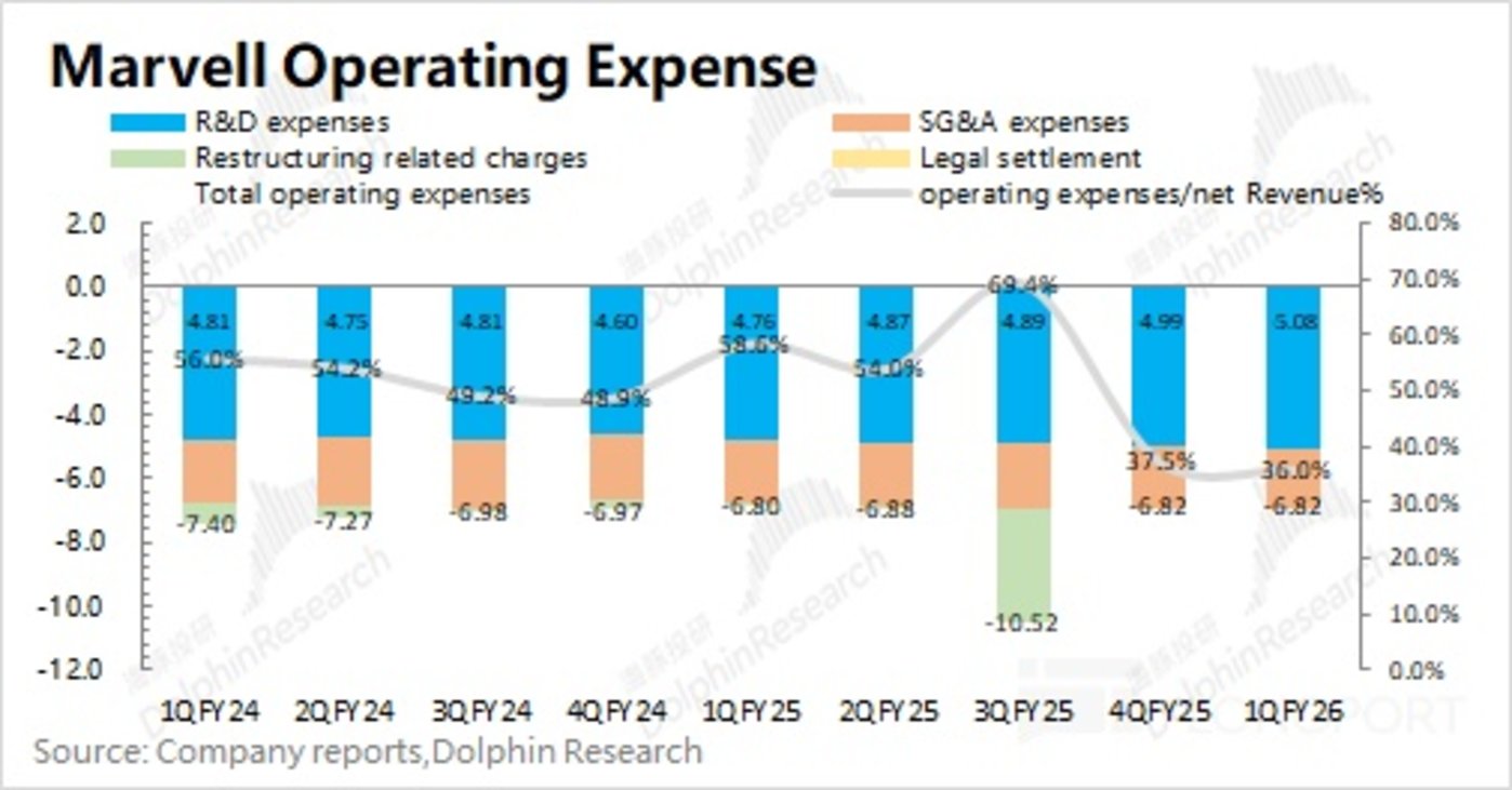 迈威尔科技 Marvell 在 2026 财年第一季度的经营费用为 6.82 亿美元,与上季度环比持平。