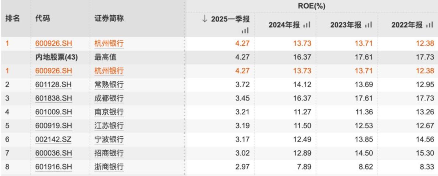 成都银行与杭州银行有着较高的相似度。2024年和今年一季度,二者净利润增速较快,净资产收益率在一众银行股中保持领先地位。