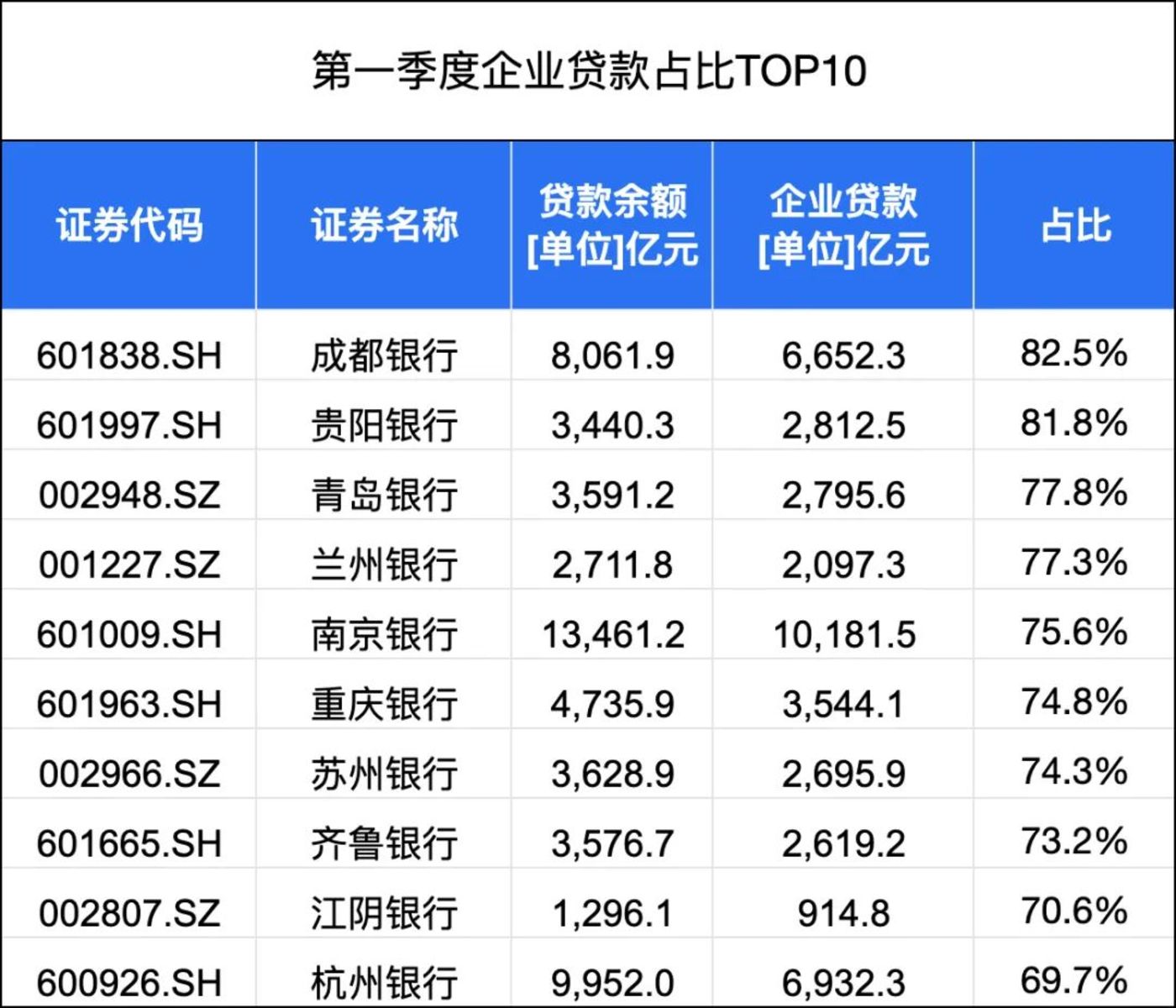 其中,成都银行就是典型的代表,成都银行一度因高占比的对公业务成为“偏科生”。截至3月末,成都银行的企业贷款占比高达82.5%。