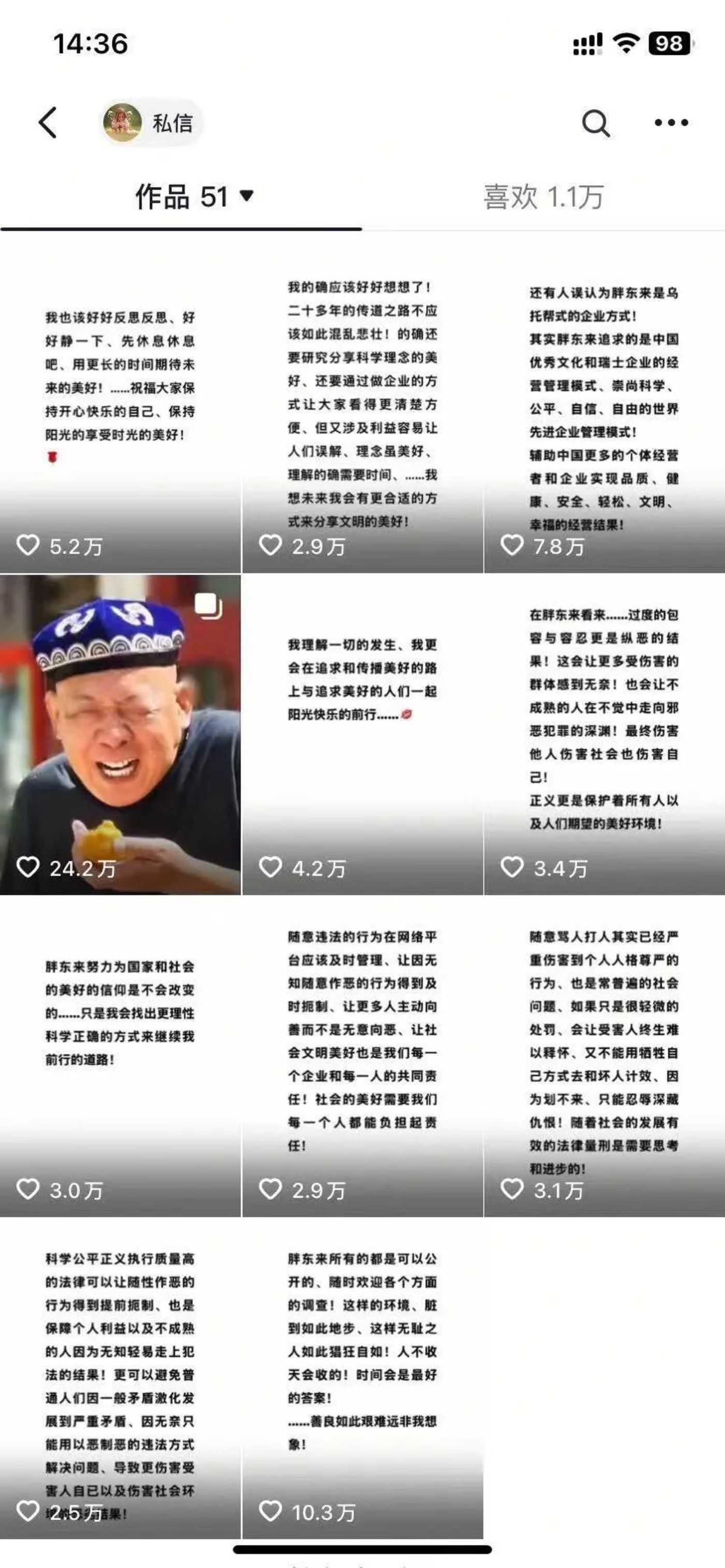 于东来显然对这样的处理不算满意。5月6日,他的账号重新开放,发布了10条情绪激动的宣言。大意就是非常委屈,“……善良如此之难远非我想象!”继续点名平台,应该加强管理,“随意违法的行为,在网络平台应该及时管理”,“过度包容与容忍更是纵恶的结果!”