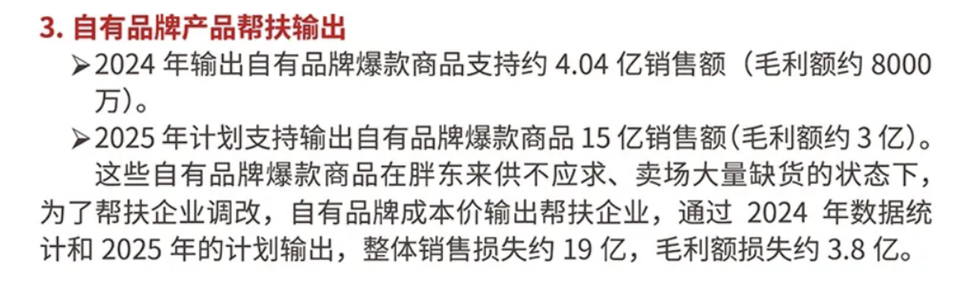 实际情况是,胖东来在自有品牌商品供不应求的情况下,仍以成本价向帮扶企业输出爆款商品,这导致胖东来自身损失19亿元潜在销售和3.8亿元毛利。19亿怎么算出来的?在胖改渠道的销售额2024年4亿+2025年预计的15亿。