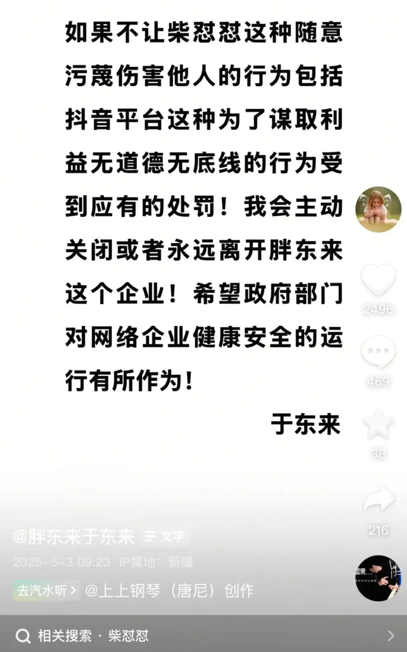 但令人多少没想到的是,于东来这次不愿意仅就事论事,被点燃的怒火与日俱增,在五一期间不断“放大招”。5月3日,他表示,如果抖音不让“柴怼怼这种随意污蔑伤害他人的行为”受到应有的处罚,“我会主动关闭或永远离开胖东来这个企业!”然后,当时拥有378万粉丝的抖音账号@胖东来于东来 被暂时关闭。