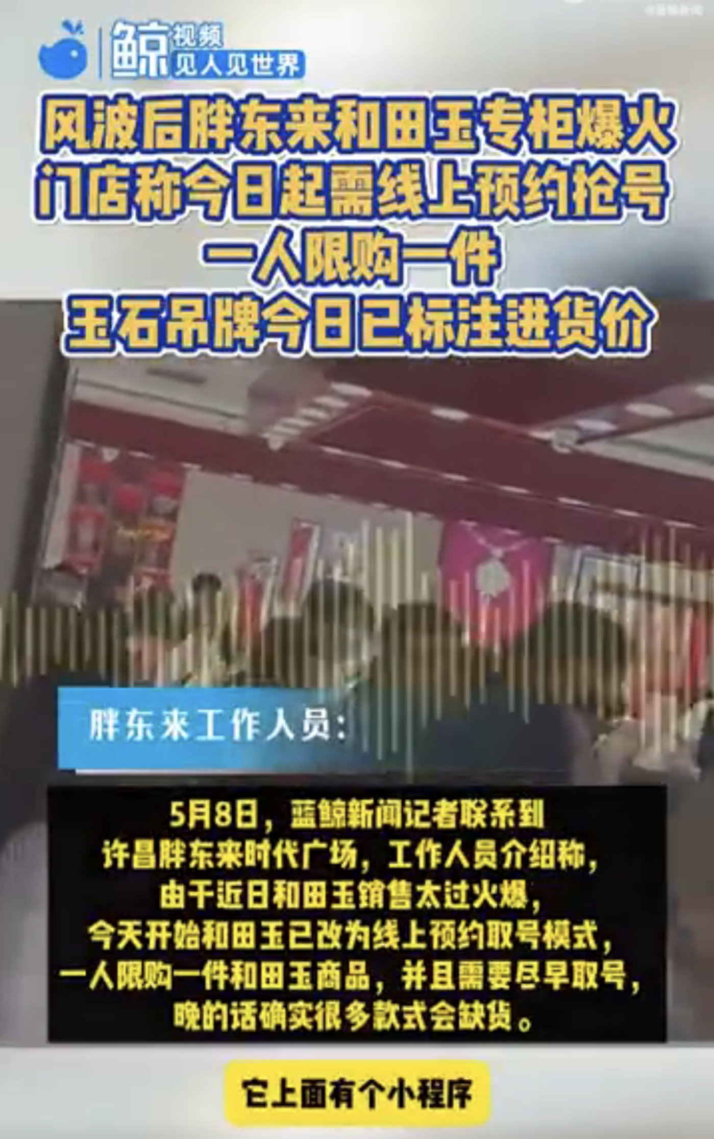 5月5日,微信公众号“许昌市场监管”就发布消息,胖东来的和田玉商品平均毛利率不超过20%,目前在售和田玉商品均按规定明码标价。