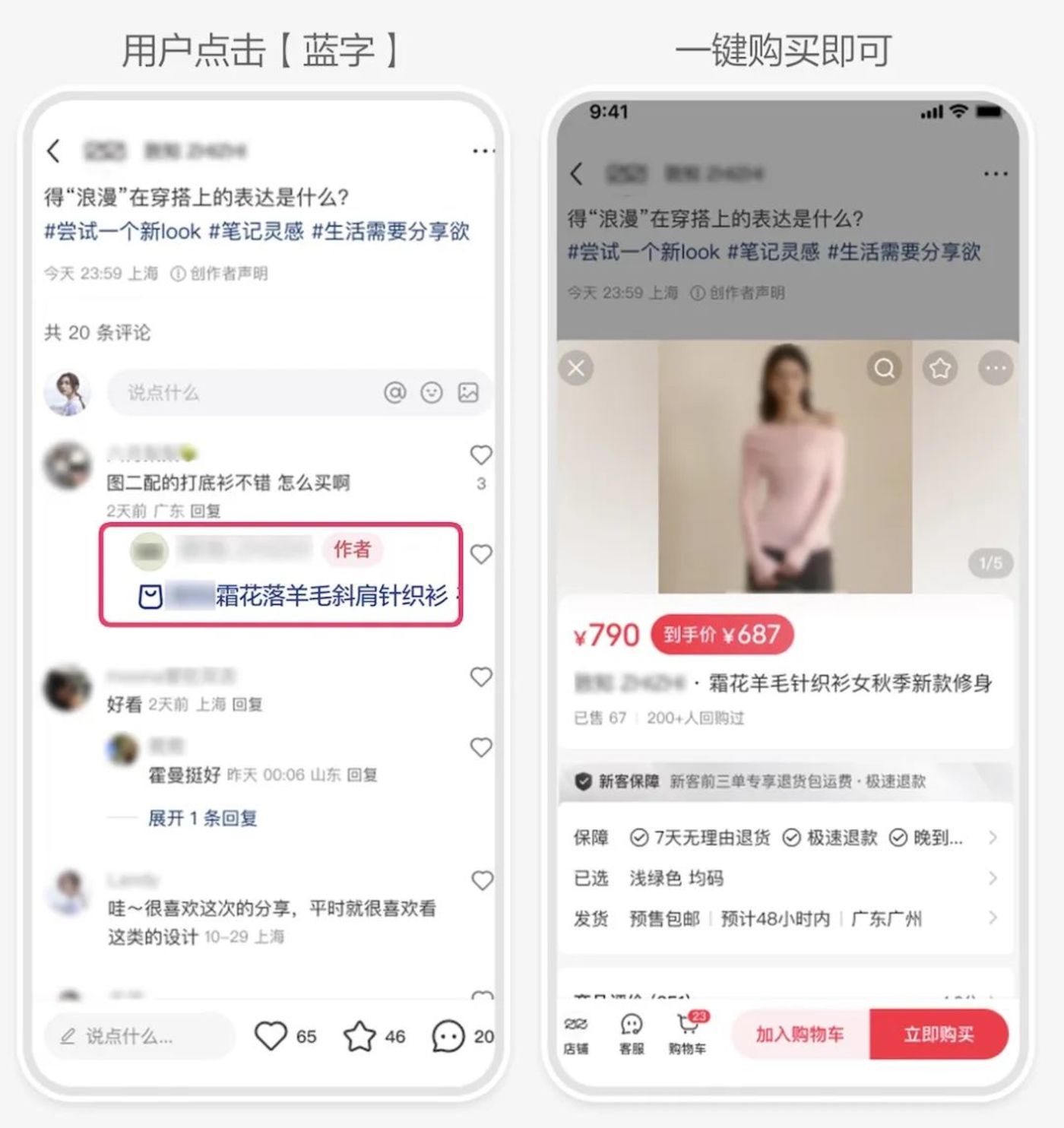 今年2月,小红书上线了评论区蓝链。用户可以在评论区发表蓝色商品链接,点击链接后,就能直接跳转到站内的商品完成购买,同时还不影响笔记本身的分发流量池。