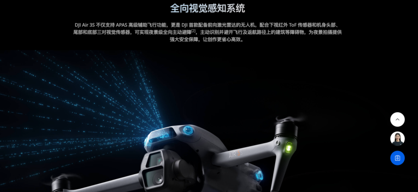 DJI Air 3S就是首款消费级搭载前向激光雷达的无人机,有效探测距离达30米,支持暗夜环境避障,有点像智能汽车上的高阶辅助驾驶系统,利用激光雷达+摄像头来捕捉环境细节实现避险。