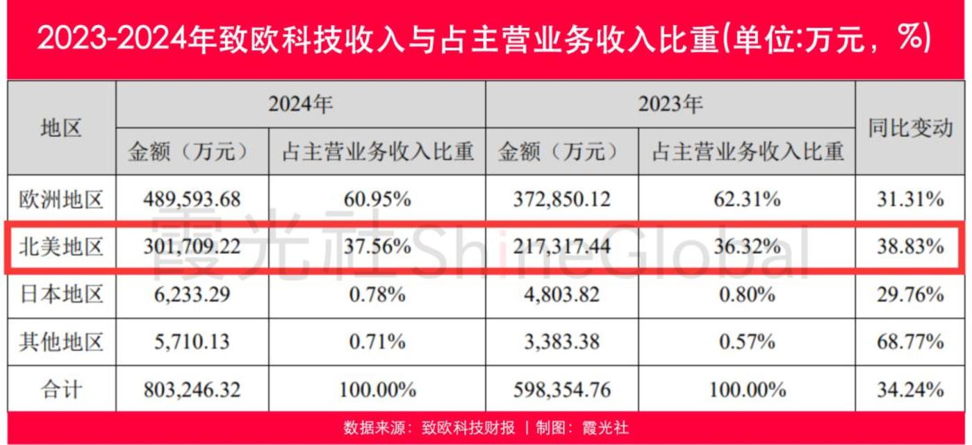 2024年,致欧科技在北美地区收入来到了30.17亿元,同比大增38.83%。