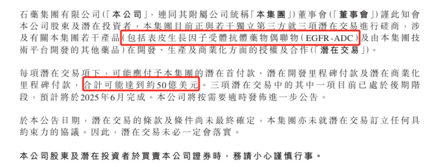 2025年5月末,石药集团发布公告称,其正在与独立第三方推进总额达50亿美元的BD合作,涉及包括EGFR-ADC等多个药物项目授权。该合作预计将在6月完成。这也意味着,石药集团的创新药管线终于要商业化了。