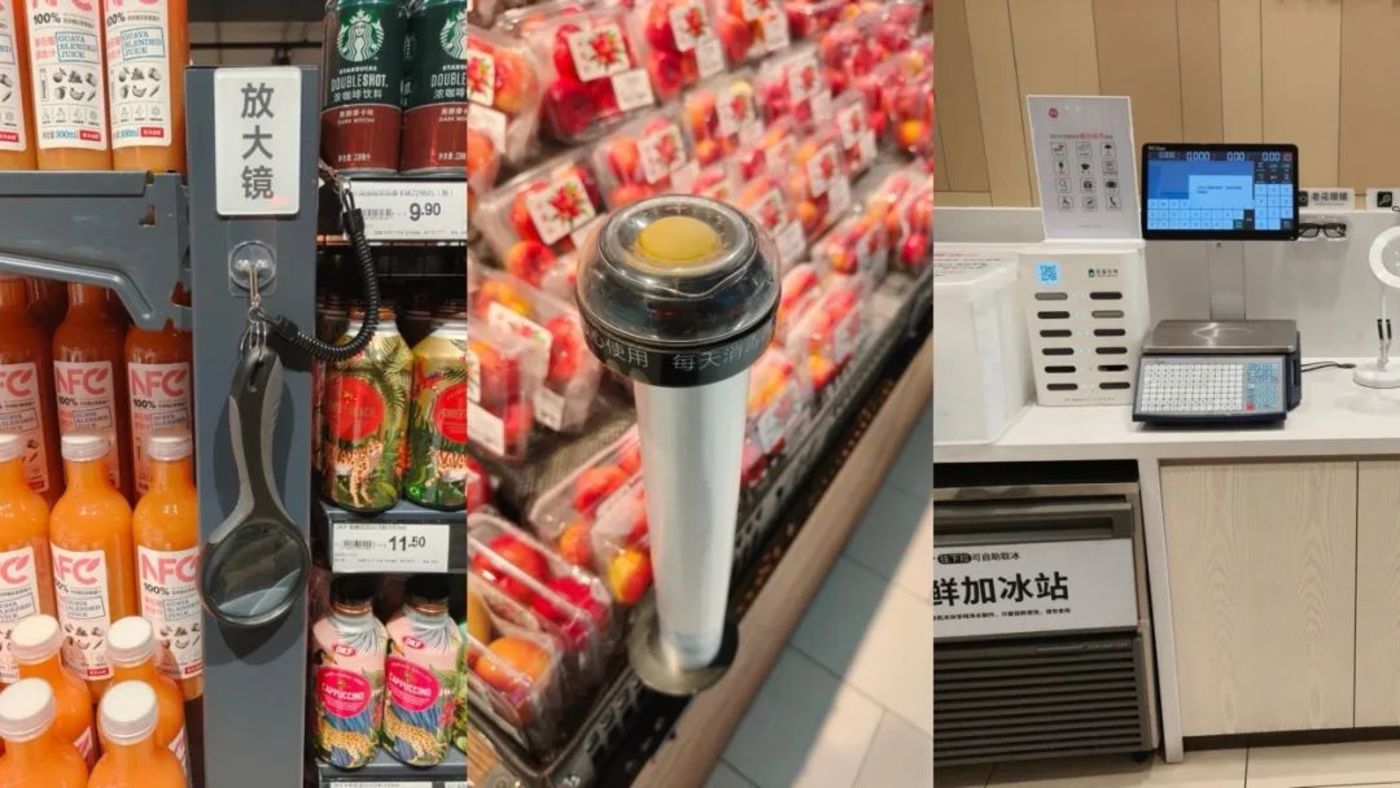 当然,虽然客流不再拥挤火爆,但永辉胖改店的服务细节并没有“打折”。比如一次性塑料袋上的湿手器、冻品区域的厚手套、货架旁的放大镜等都有保留;据笔者体验,工作人员也几乎保持了“微笑服务”。