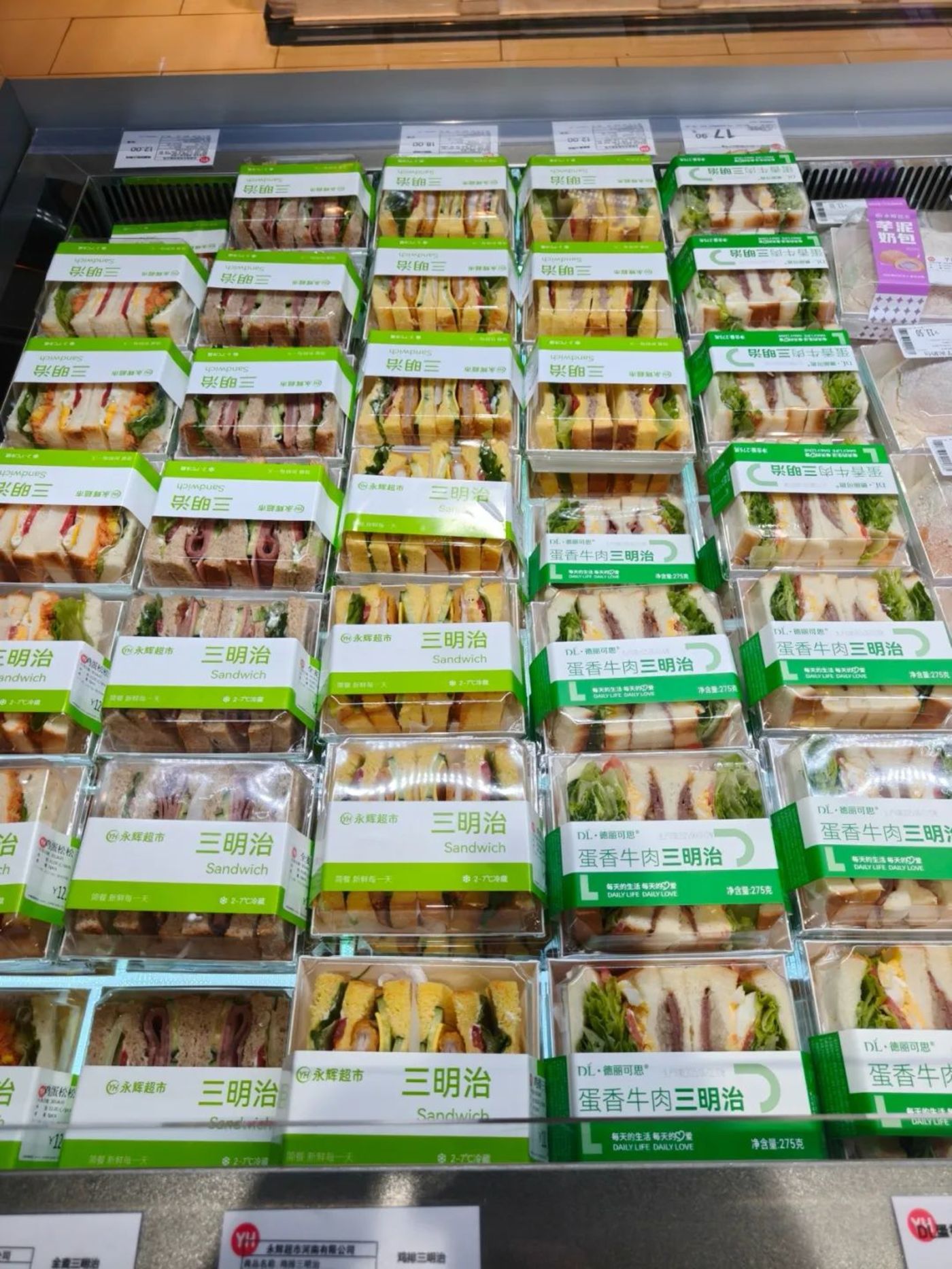 另外,在信万广场店内,DL自营和永辉自营的三明治摆放在一起,由于都选择了相似的绿字白底包装配色,消费者甚至很难一眼分辨出来二者的差别。