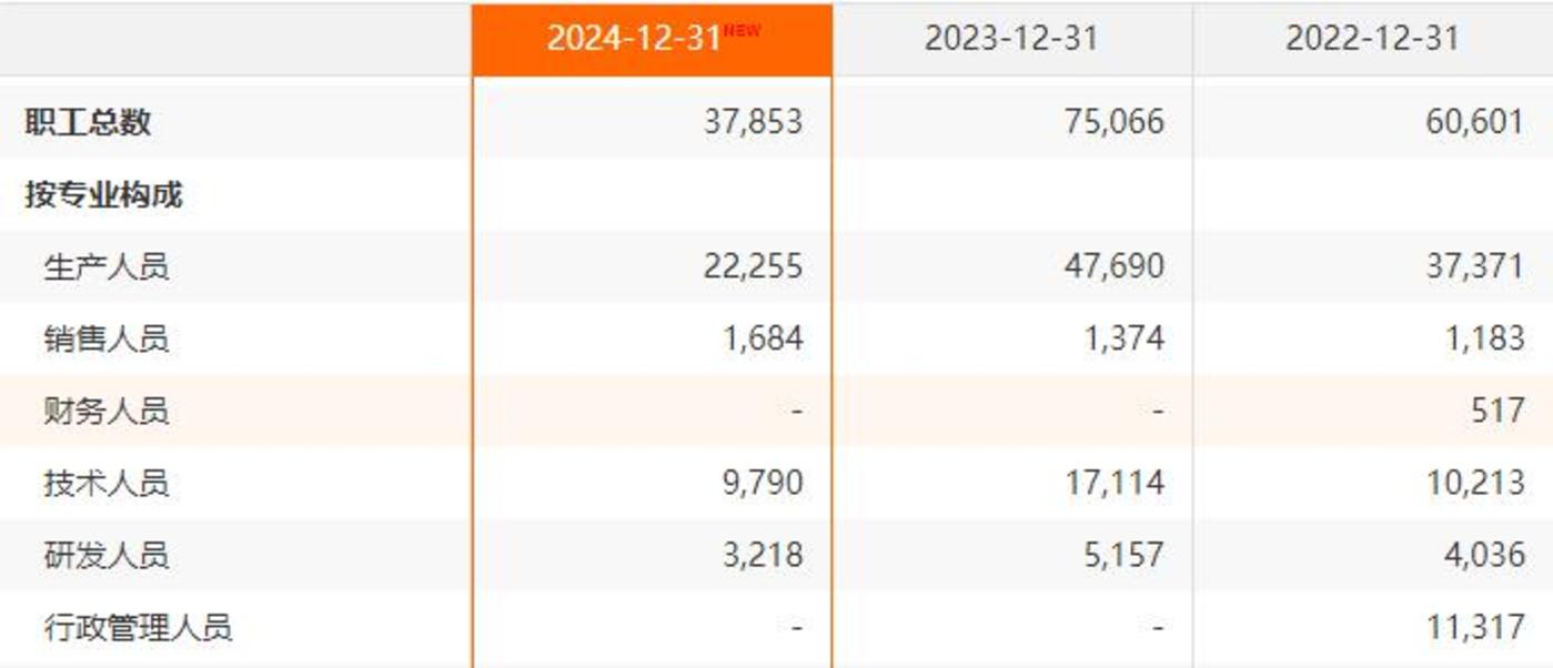 其中生产人员降幅最大,比例超过50%。其次技术人员总数也被腰斩。预期行政人员也被大幅缩减。