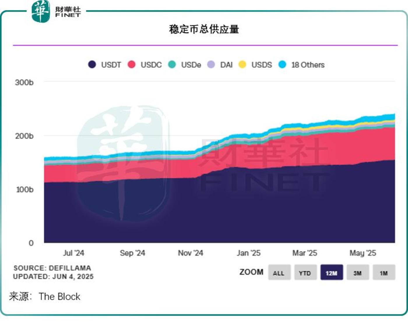 根据The Block的数据,于2025年6月4日,全球稳定币总市值或为2,399亿美元。从币种来看,Tether的USDT是规模最大的稳定币,流通市值或为1,542.9亿美元,Circle所发行的USDC为第二大稳定币,市值或约609.4亿美元,这两大稳定币或占了全球稳定币总市值的89.72%,其中第二大稳定币USDC的占比或为25.40%,与第一大稳定币USDT大约64.31%仍有较大的差距,见下图。