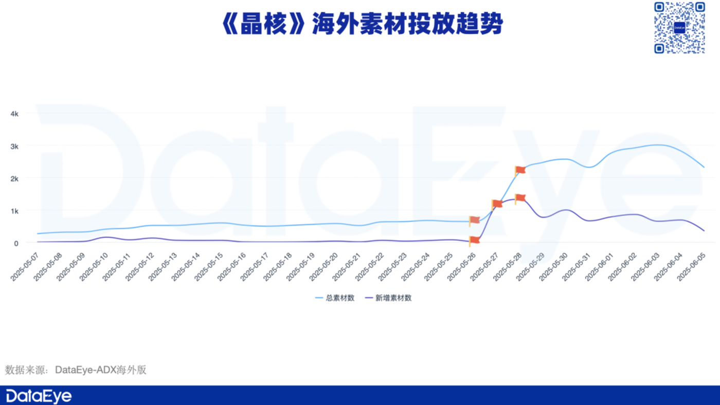 DataEye-ADX数据显示,从投放趋势来看,《晶核》在今年2月份就开始着手布局素材投放,但整体素材投放量并不突出,日均素材投放维持在个位数的区间。直到上线当天,素材投放量才有了明显的提升,单日投放量超千组素材。