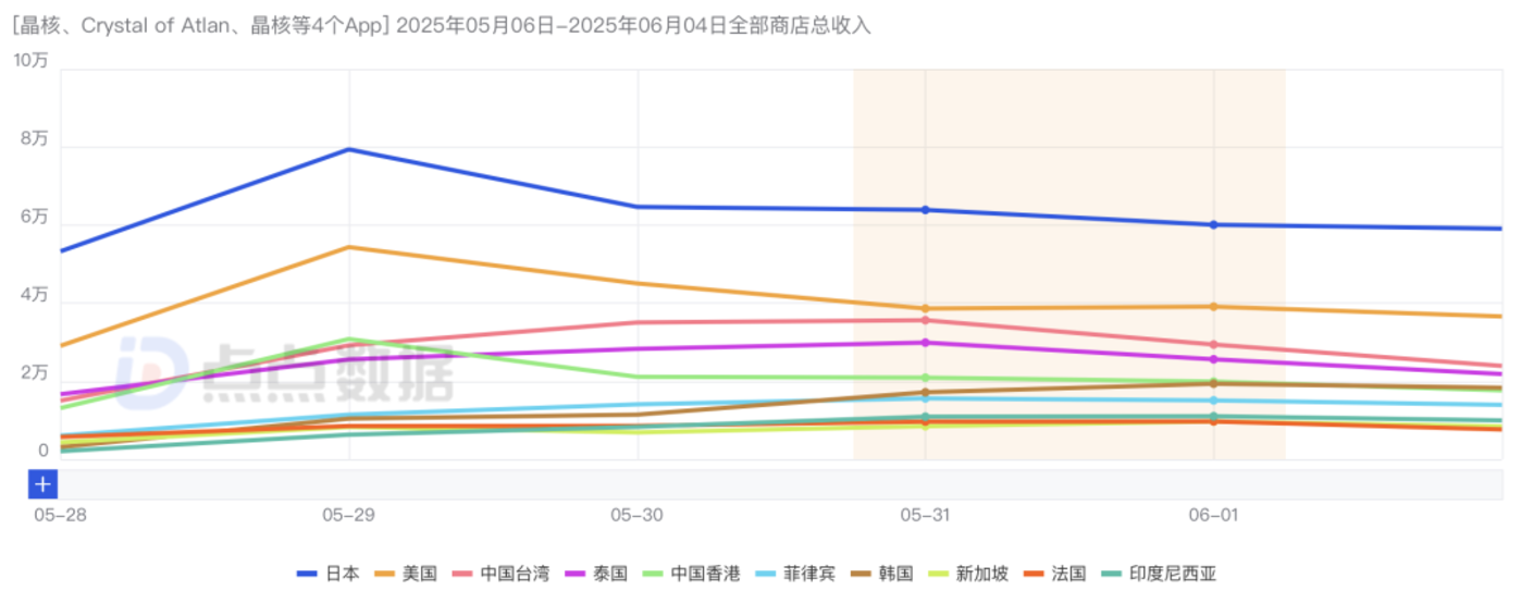 点点数据显示,截止至6月2日,《晶核》双平台预估收入约为1411万元。(扣除平台分成)其中日本市场提供超24%的收入来源,美国市场则占比超14%。