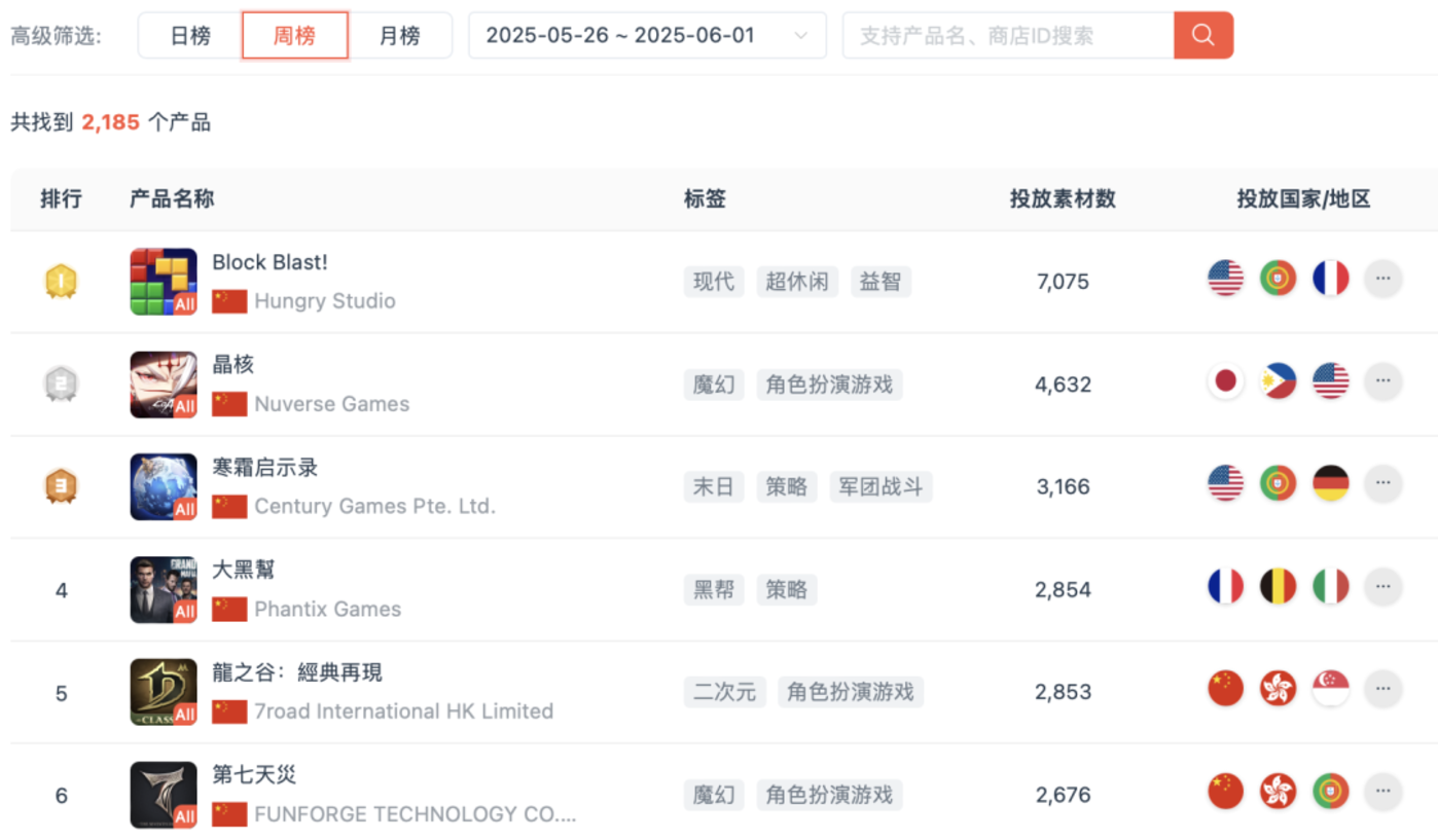 素材投放量较为突出:单日超千万组素材的投放量,已经在投放周榜超过《寒霜启示录》在海外的投放量。这从侧面印证了字节对于该产品抱有较高的期望值,在上线初期就倾注大量资源。