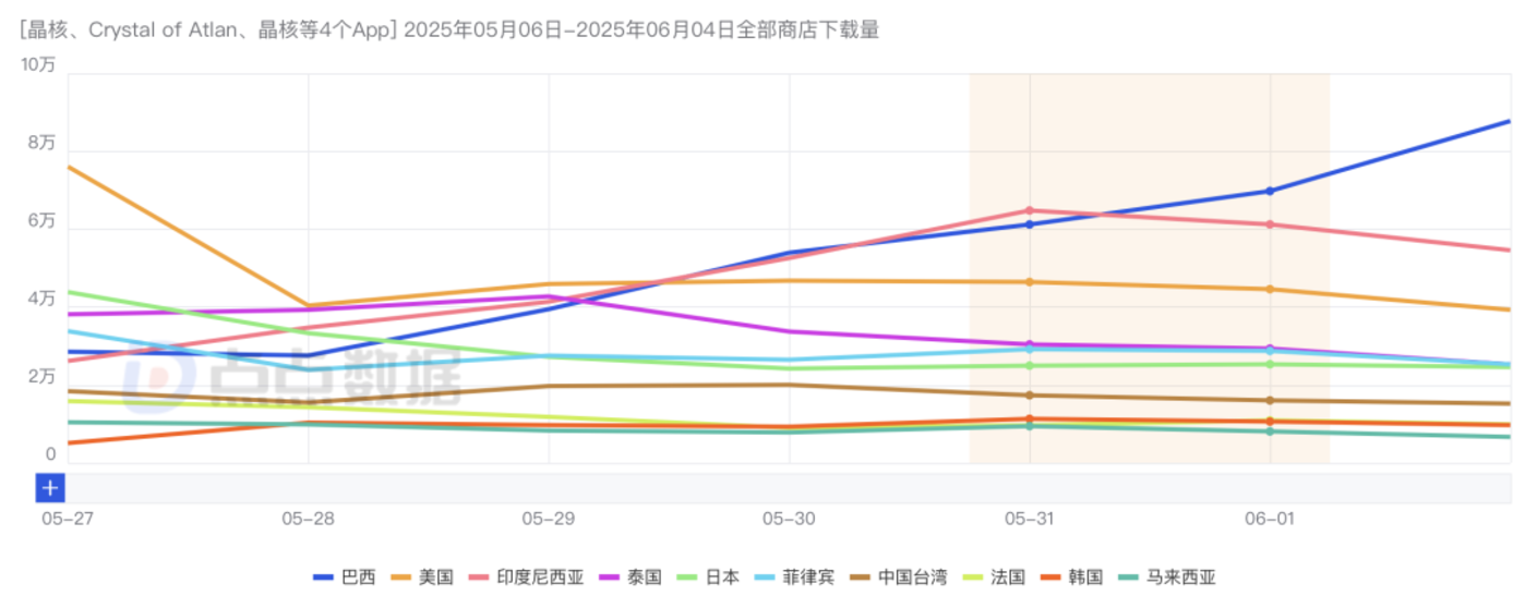 点点数据显示,截止至6月2日,《晶核》单iOS台预估下载量约为264万人次。(含27日预下载成绩)其中巴西市场提供超13%的下载来源,美国市场则占比超12%。