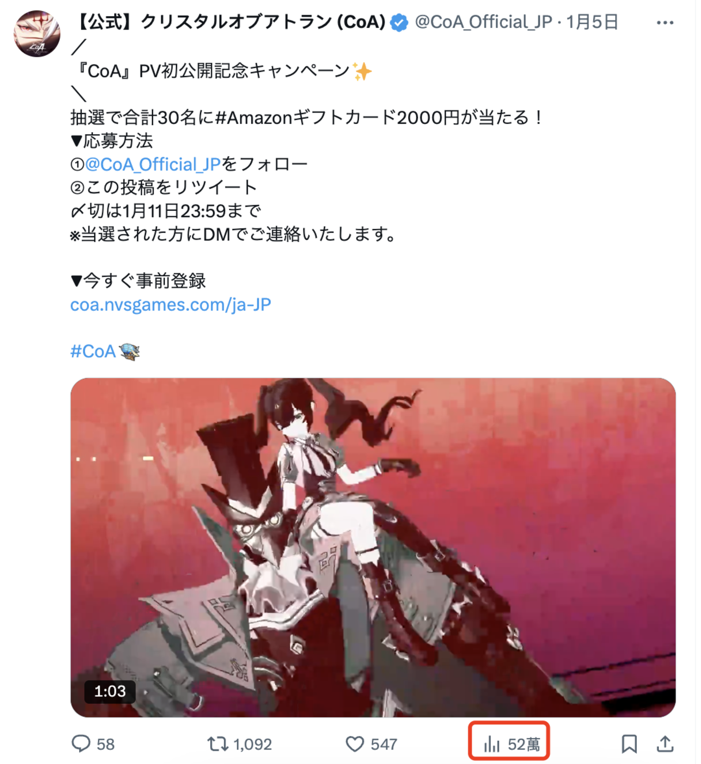 而在推特平台(X),《晶核》同样是在1月份创建官方账号,并且首先传播内容就得到了52万的观看次数。值得关注的是,《晶核》在推特平台更重视日韩市场,且日本市场关注人数超5.2万人次,韩国市场关注人数仅有千余人。