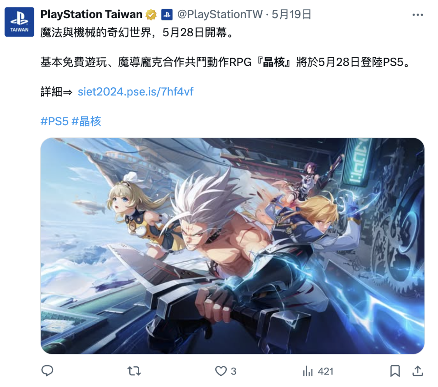 针对台湾市场:在游戏上线前夕,《晶核》在社媒平台举办了多个相关活动。一方面,邀请大量COSer扮演游戏角色;另一方面,发布「送声优签名」活动。