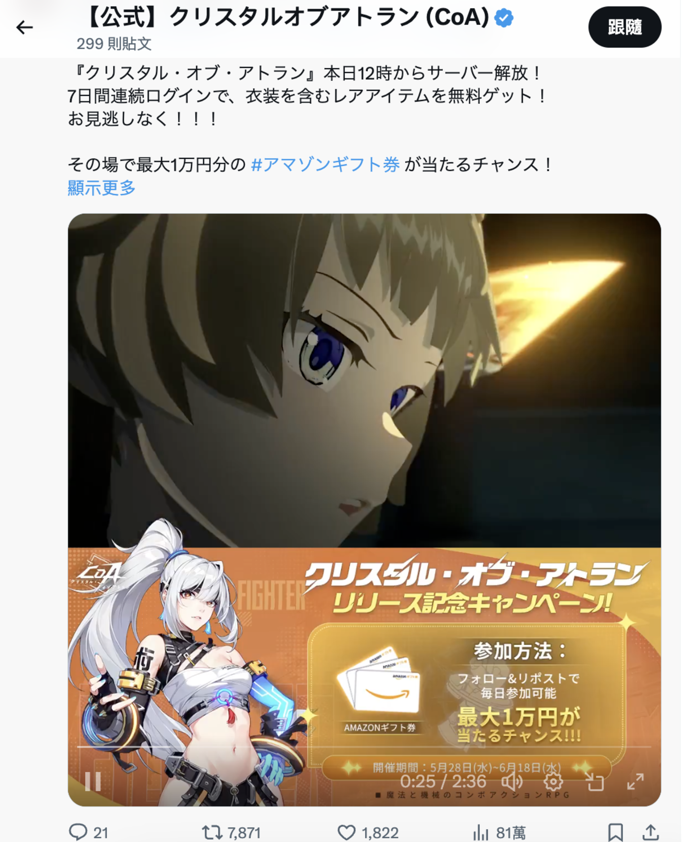 其三:重视日本市场。《晶核》在日本市场动作频频,大搞线上、线下活动,甚至还直接「撒币」,抽奖亚马逊礼券。如此可以看出《晶核》对于日本市场的重视程度。