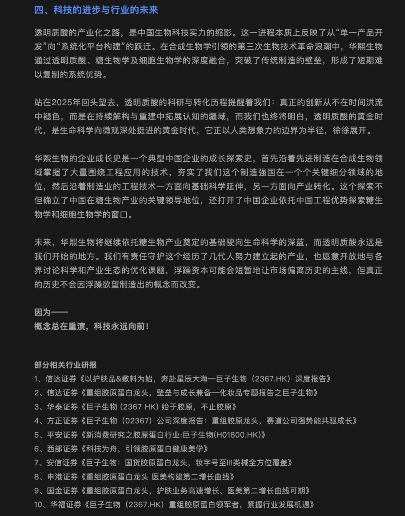 华熙生物《概念总在重演,科技永远向前》文章列出的“玻尿酸过时论”研报