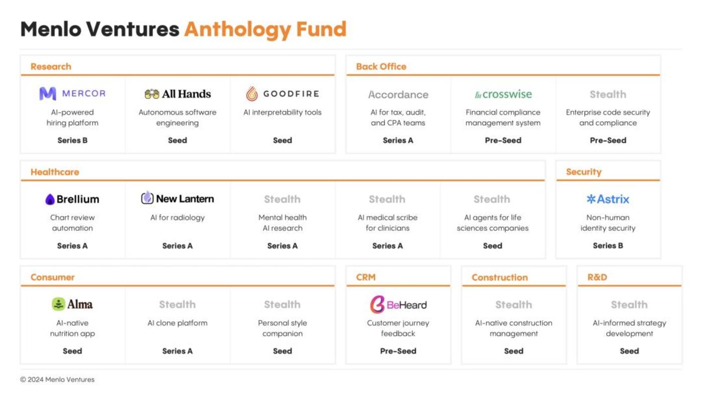 去年7月,Anthropic与其重要投资者Menlo Ventures联手设立一项名为「Anthology Fund」的基金,和OpenAI一样,开始建立自己的「初创企业帝国」,官网上向初创企业这样形容:“成为Anthropic旗下公司不仅仅是获得一张支票,还能获得Anthropic技术团队的持续指导和支持。”